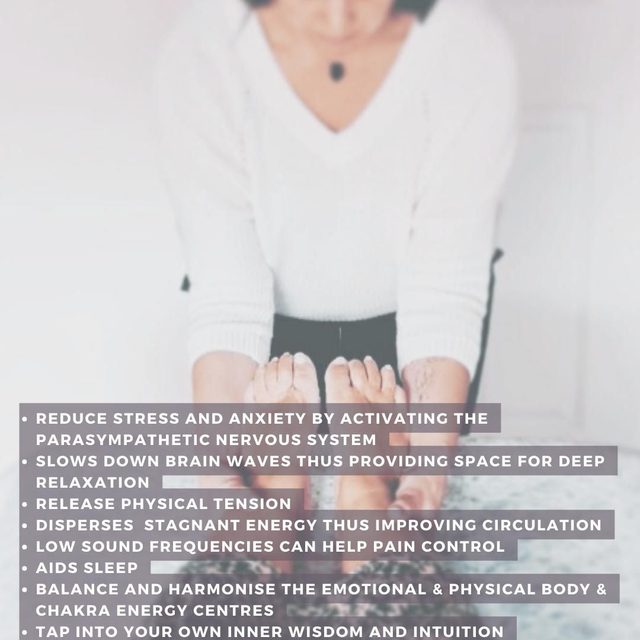 Sound Healing is the therapeutic application of sound frequencies to the body/mind of people with the intention of bringing them into a state of harmony and health. Using sound to massage your cells it is non invasive therapy that relaxes the mind & allows deep rest and healing to occur as the sound pulsates & vibrates releasing tensions and energy blocks.